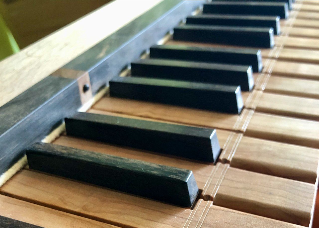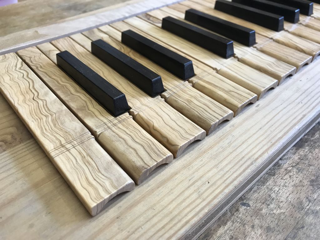 Das Gehäuse ist aus heimischem Nussbaum, die Klaviatur aus Wildolive und Ebenholz.