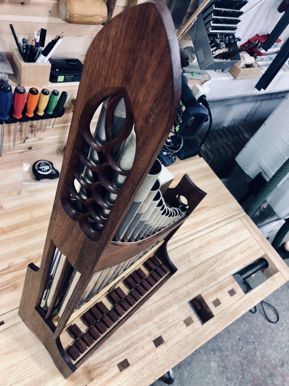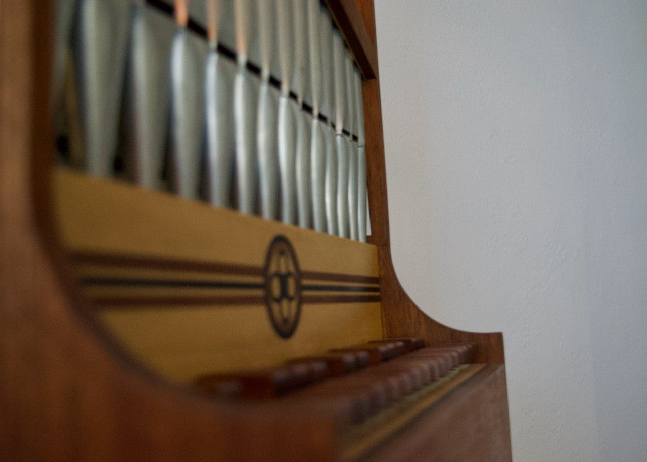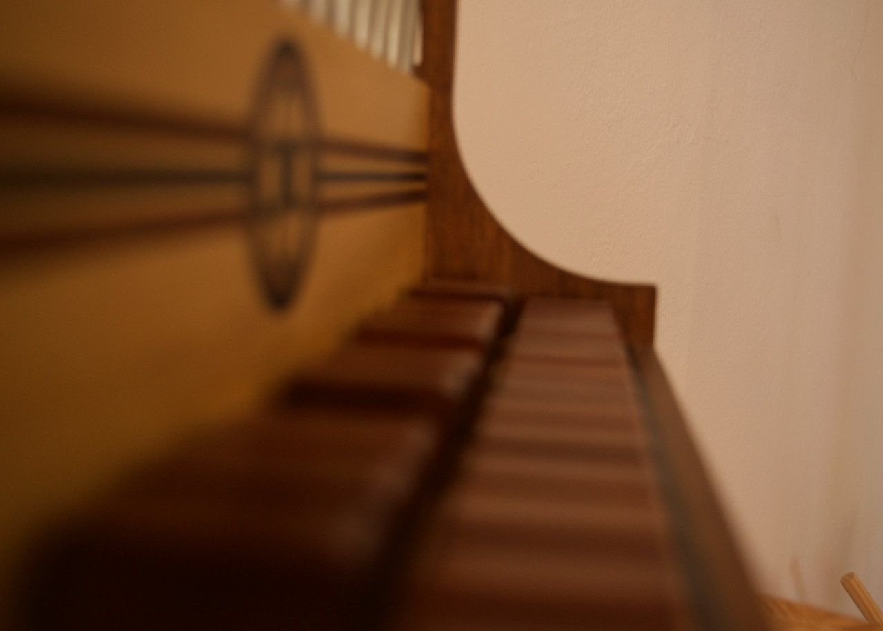 Das Gehäuse ist aus Nussbaum, Windlade aus leichtem Lindenholz und die Tasten aus Zwetschgenholz.
